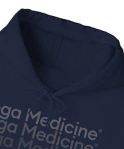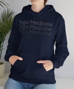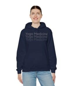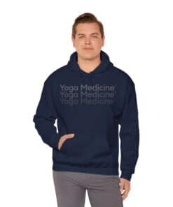 This unisex heavy blend hooded sweatshirt is relaxation itself with kangaroo pockets and hood drawstrings that are the same color as the sweater. The unique, faded logo is sure to make you stand out on the yoga mat. With material that is a thick blend of cotton and polyester, this hoodie makes for a plush, soft feel alongside warmth.