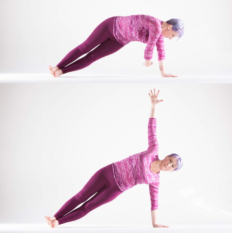 Keeping the head of your supporting arm firmly centered in the shoulder socket, allow your hips to lower toward the mat, bringing your top arm down by your side. Then powerfully contract the side body closest to the floor to lift your hips up toward the ceiling, sweeping your top arm overhead. This is a great way to reinforce shoulder stability while building your obliques, QL, and glutei medii.